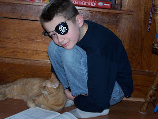 We keep our house pretty cold overnight, so when we wake up, it always feels so cold when you get out of your nice, warm bed. The kids immediately come downstairs and huddle over the vents to help warm themselves up. Here is David from this morning. He is huddling over the vent, hanging out with Joey, reading a book, while wearing an eyepatch. I guess he's trying to strengthen his eye. : ) I found it amusing.